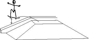A couple of pit falls to avoid: do not make ledges and railings too low. twelve inches is not that tall even for a beginner. When you combine pyramids and inclines, ledges and railings less than a foot can be dangerously low. The natural way to do all tricks is to land on the obstacle at the apex of the ollie. Too low and the skater will over shoot miss! See illustration. Ledges and railings also can get in the way of the natural flow of the park. A few good ones are better than a thousand bad ones. Make sure the placement is well thought out and not put into any space that seems to have room. With flat metal railings, make sure rounded tube stock is used and not sharp edged angle iron.